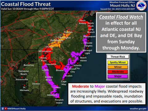 Georgetown, Del. (1 p.m. Fri., Oct. 10, 2025): A major coastal storm is on track to lash the mid-Atlantic region, including Sussex County, with heavy rains, gusty winds, and moderate to major tidal flooding throughout the Columbus Day weekend, potentially hampering travel, causing power outages, and scouring local beaches.
